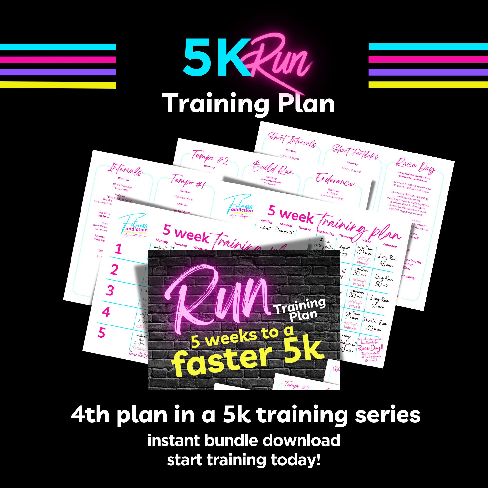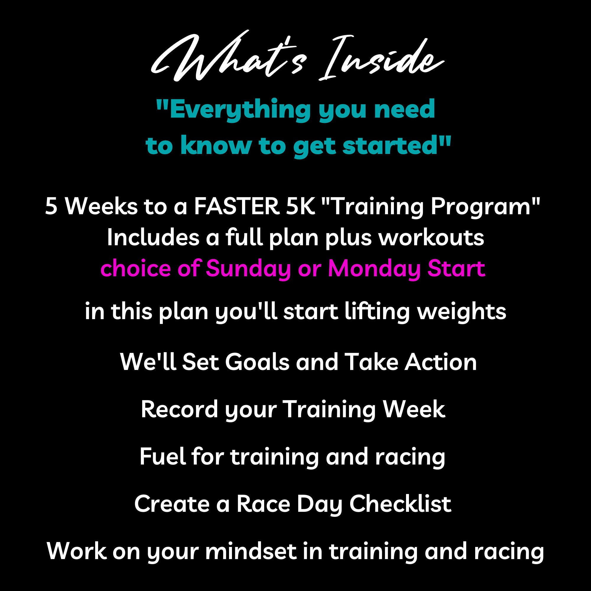 This plan includes a 5-week detailed plan that will get you running a faster 5k over the five weeks with workouts designed to get you to the finish line feeling fresh and strong!