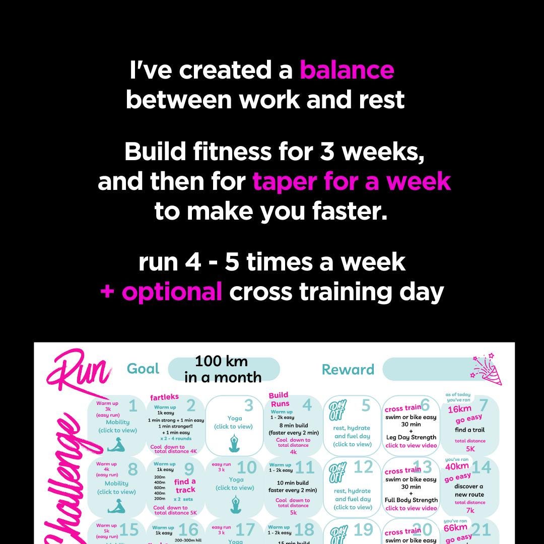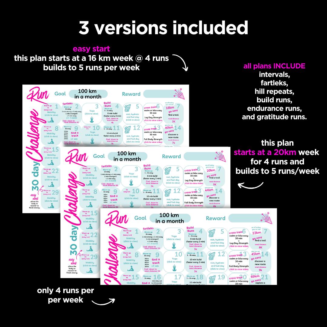 Included are 3 versions. One that starts easy and builds consistently, One that has you running only 4 times a week, One that has you running 4 - 5 times a week over time.