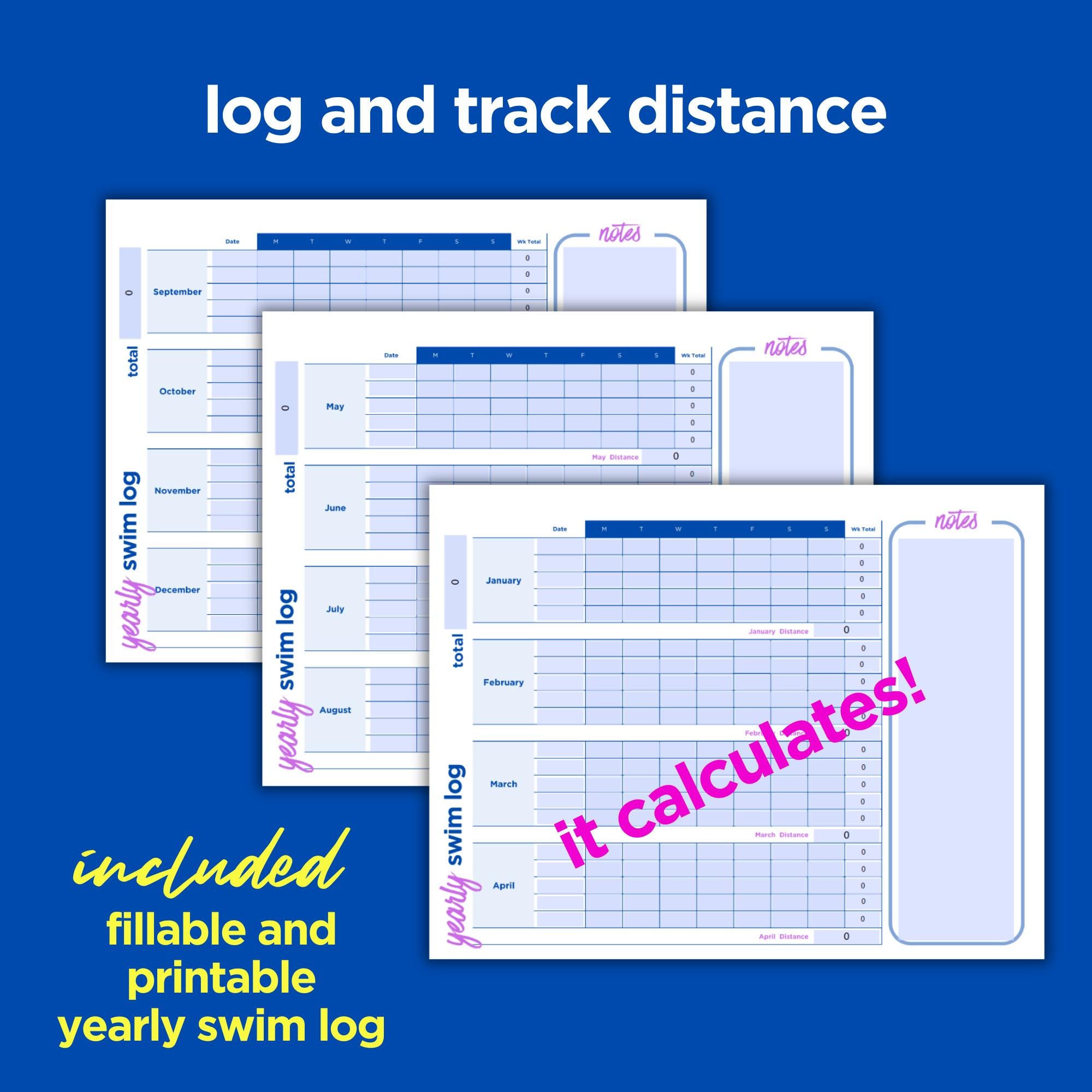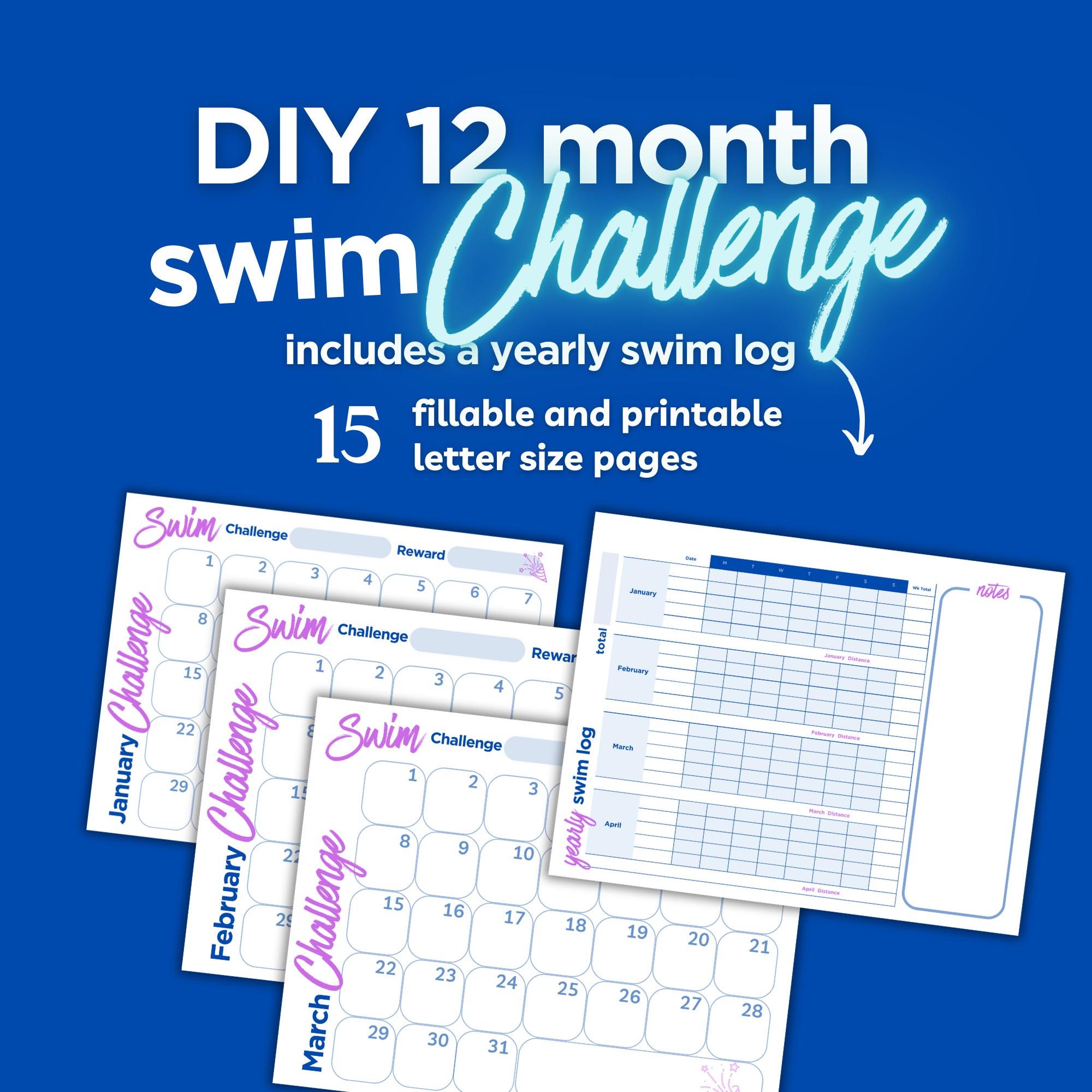 Includes a fillable pdf, a printable pdf, yearly swim log printable and fillable to track your distance as you go.