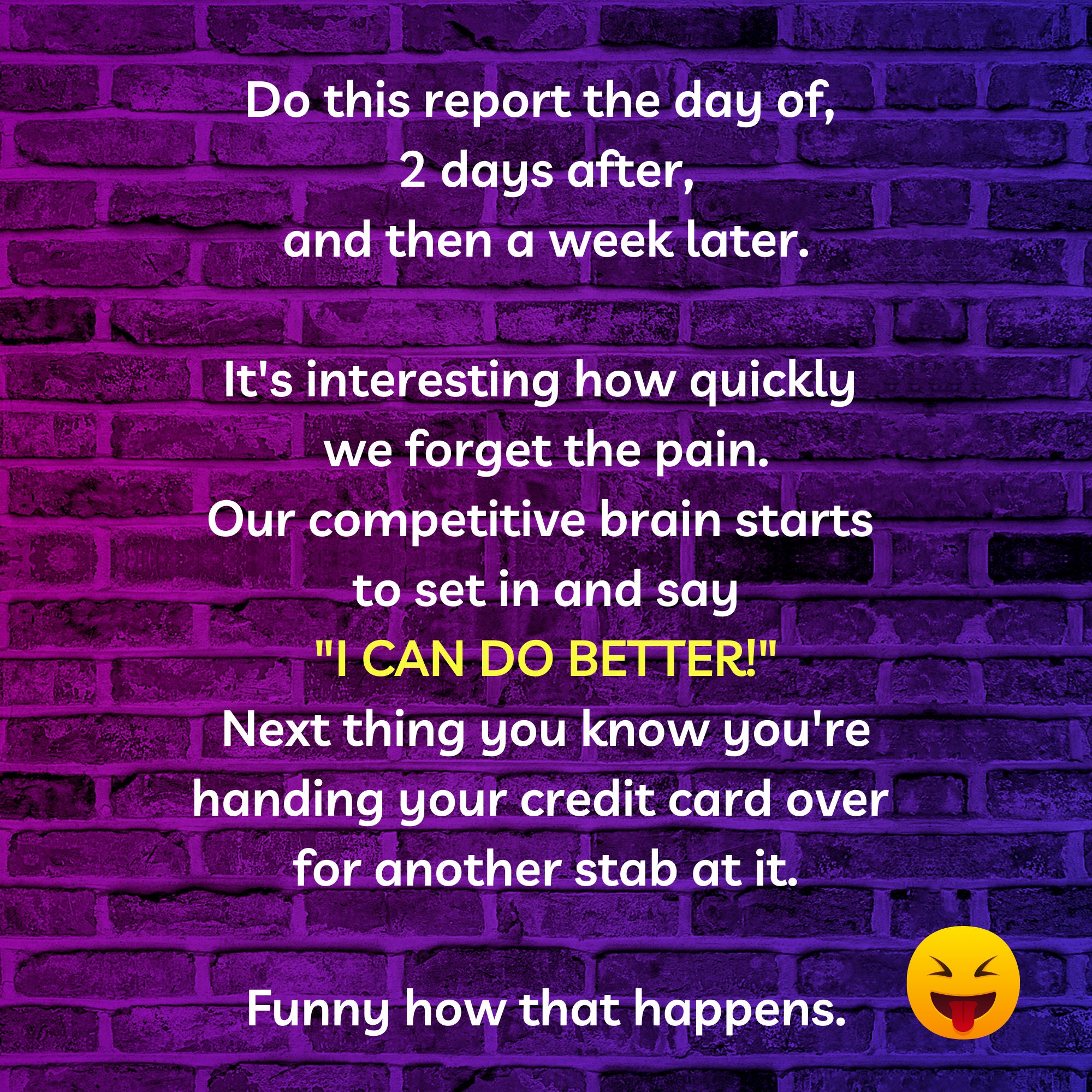 It'll help you figure out what the problem spots were and where, when, and why you felt amazing at other points. You might also love to read old reports for races that you do often. Learn from what you've experienced in the past, and either try to approach the race in a similar way or in a radically different way.