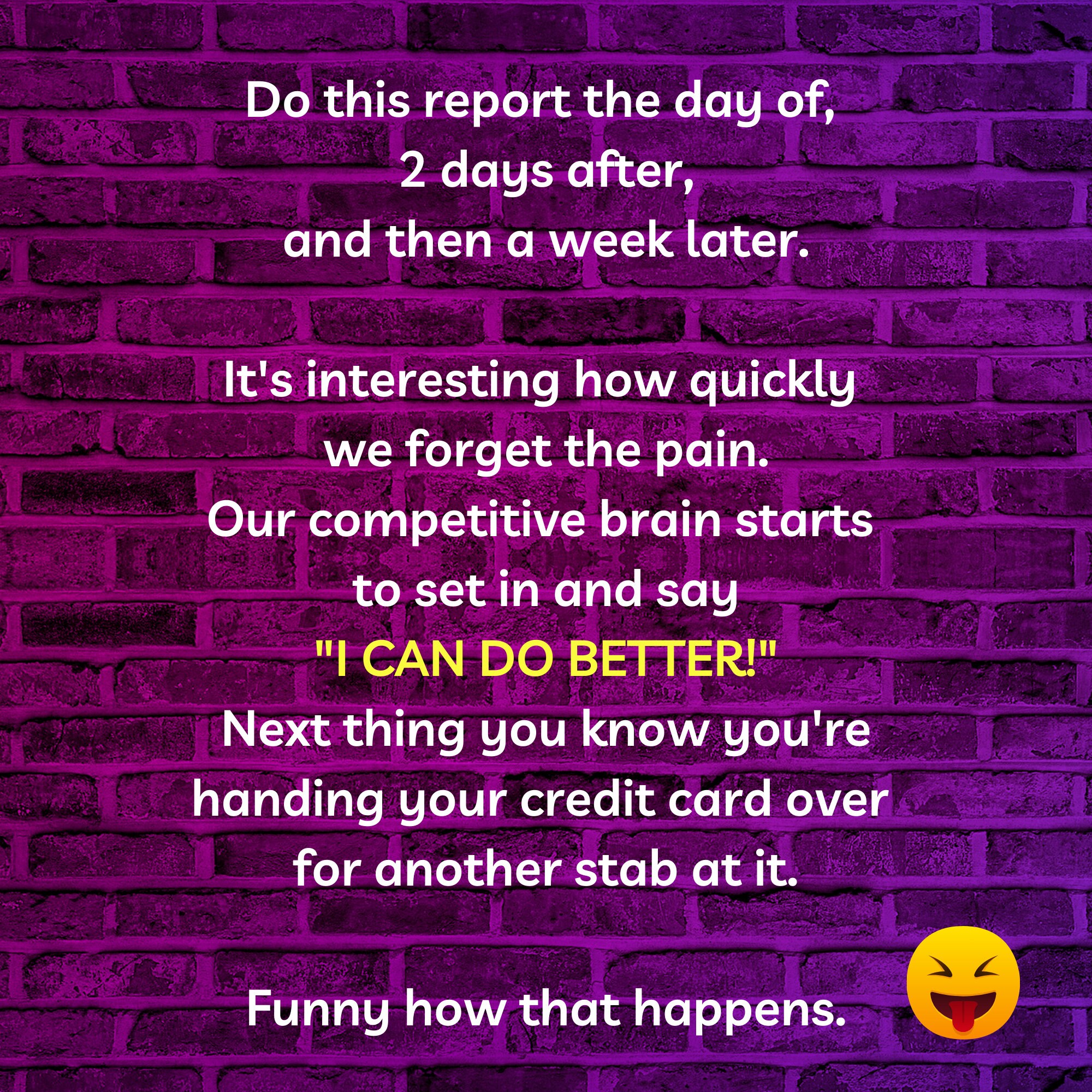 It'll help you figure out what the problem spots were and where, when, and why you felt amazing at other points. You might also love to read old reports for races that you do often. Learn from what you've experienced in the past, and either try to approach the race in a similar way or in a radically different way.