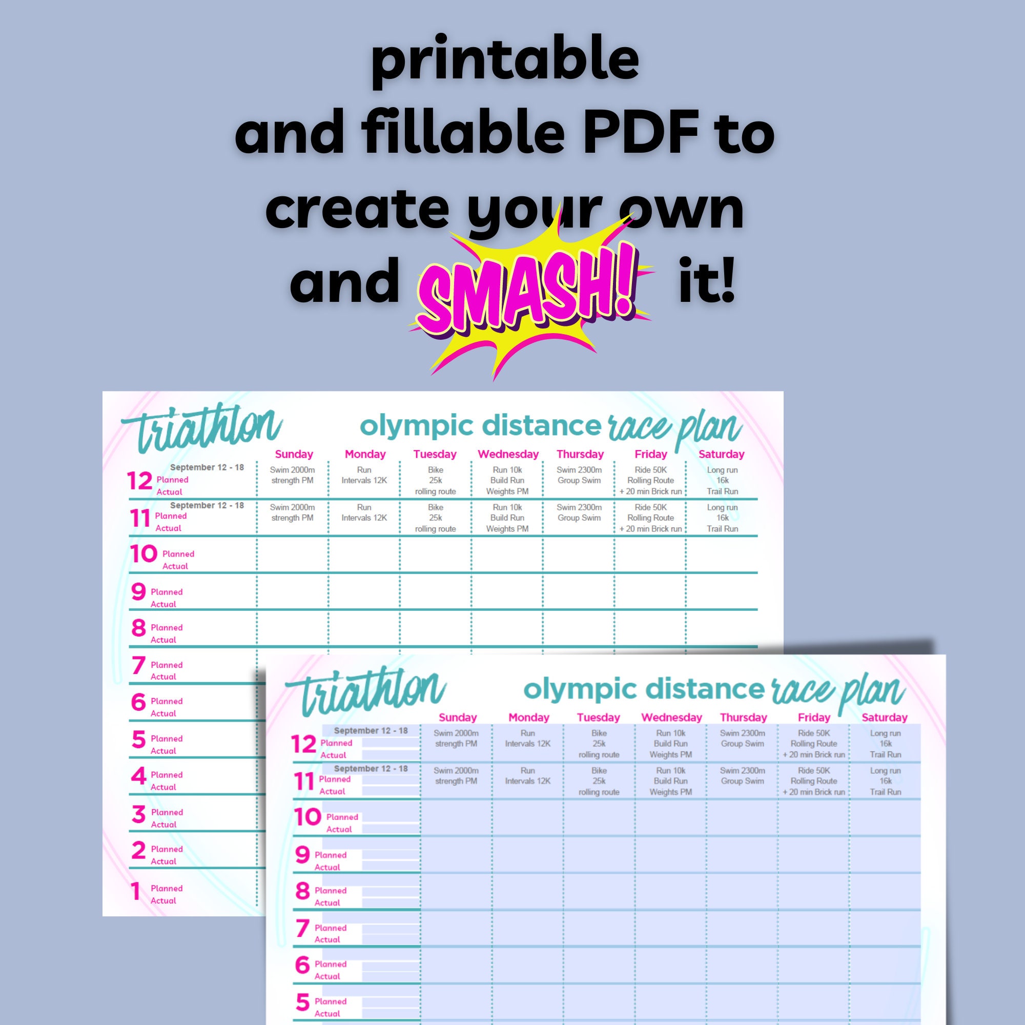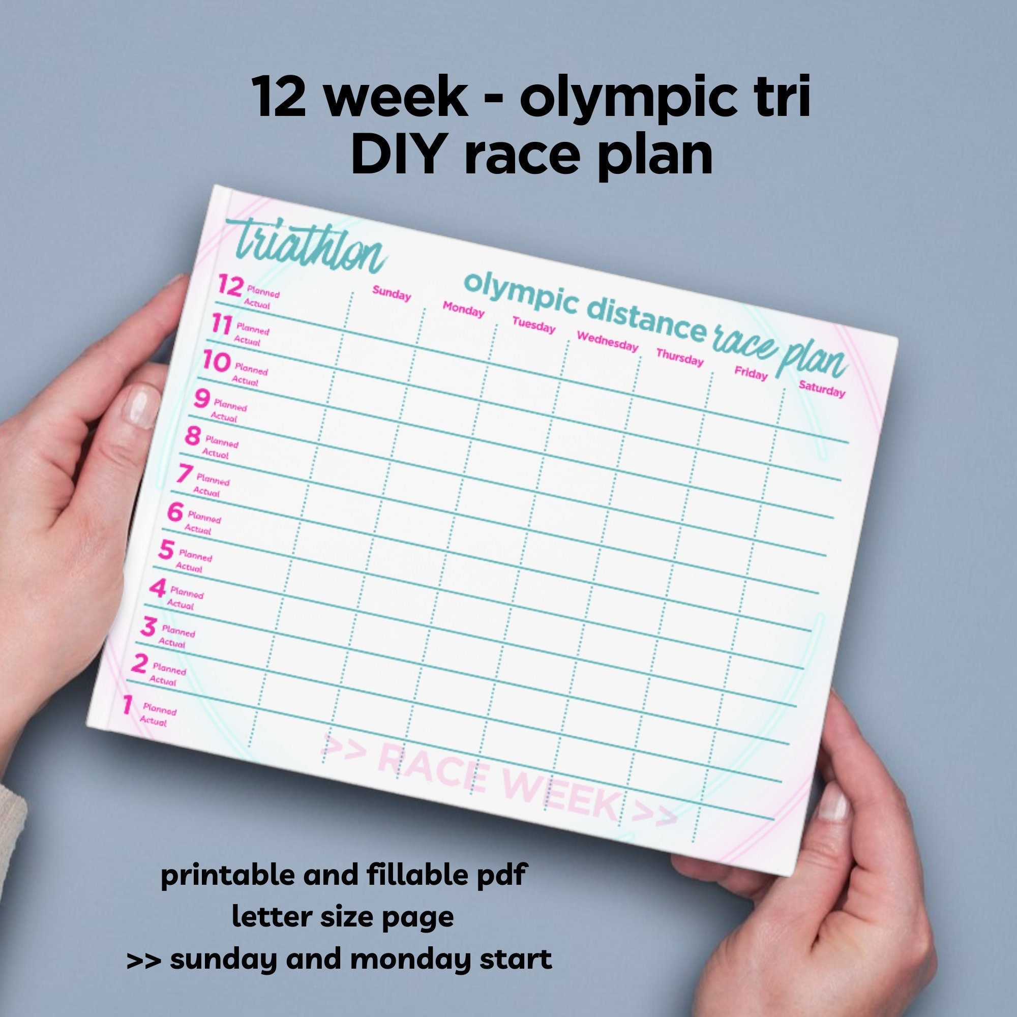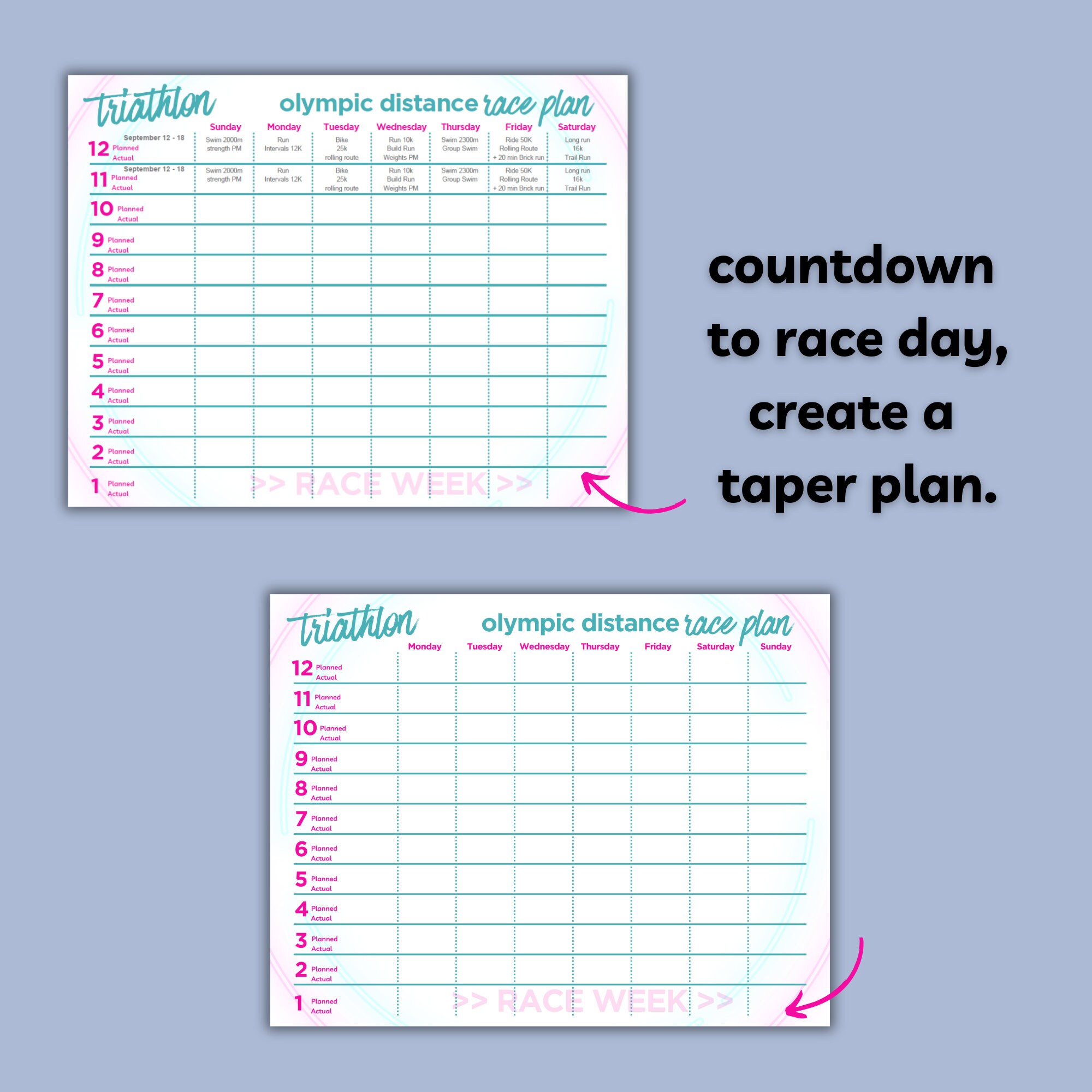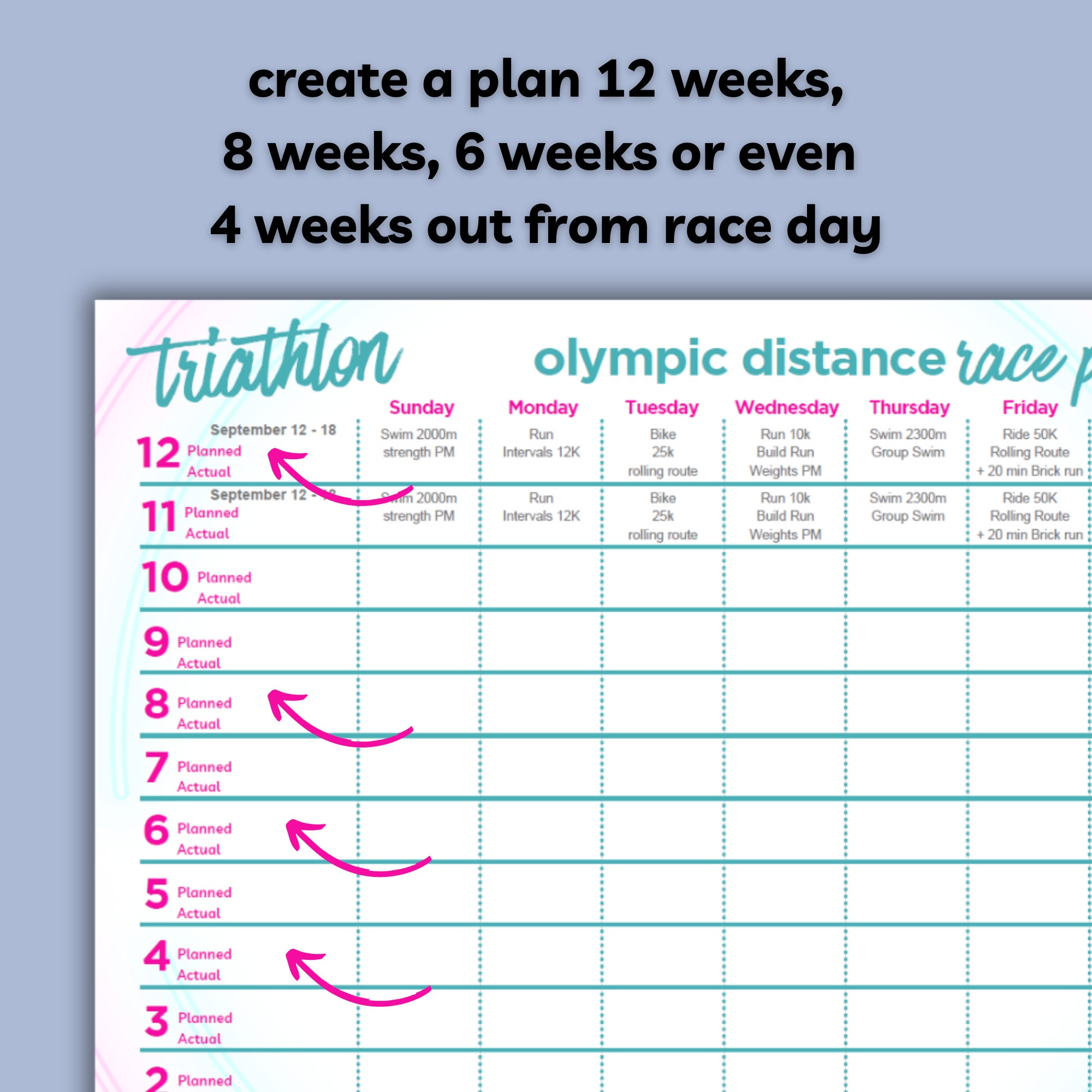 Countdown to race day. Create an Olympic distance triathlon race plan 12 weeks out, 8 weeks out, 6 weeks out or 4. Includes room for a taper plan.