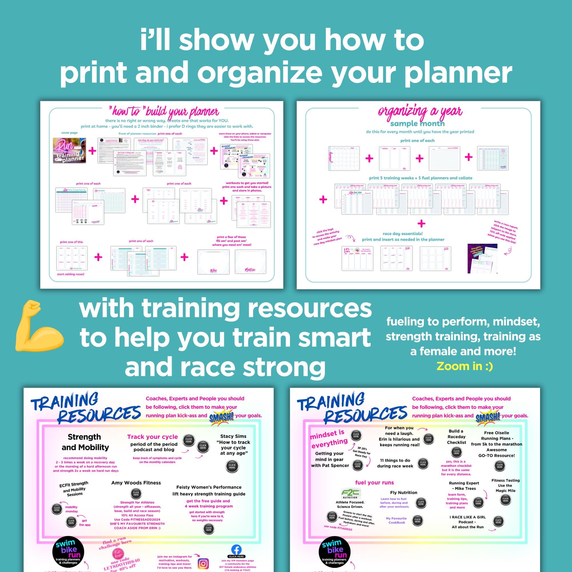 The files are ready to print, organize and assemble into a binder. What I love about a binder is that it makes adding and removing pages easy as your training evolves. When the year is done you can put it on the shelf, add photos for memories, look back at race reports and race plans easily.