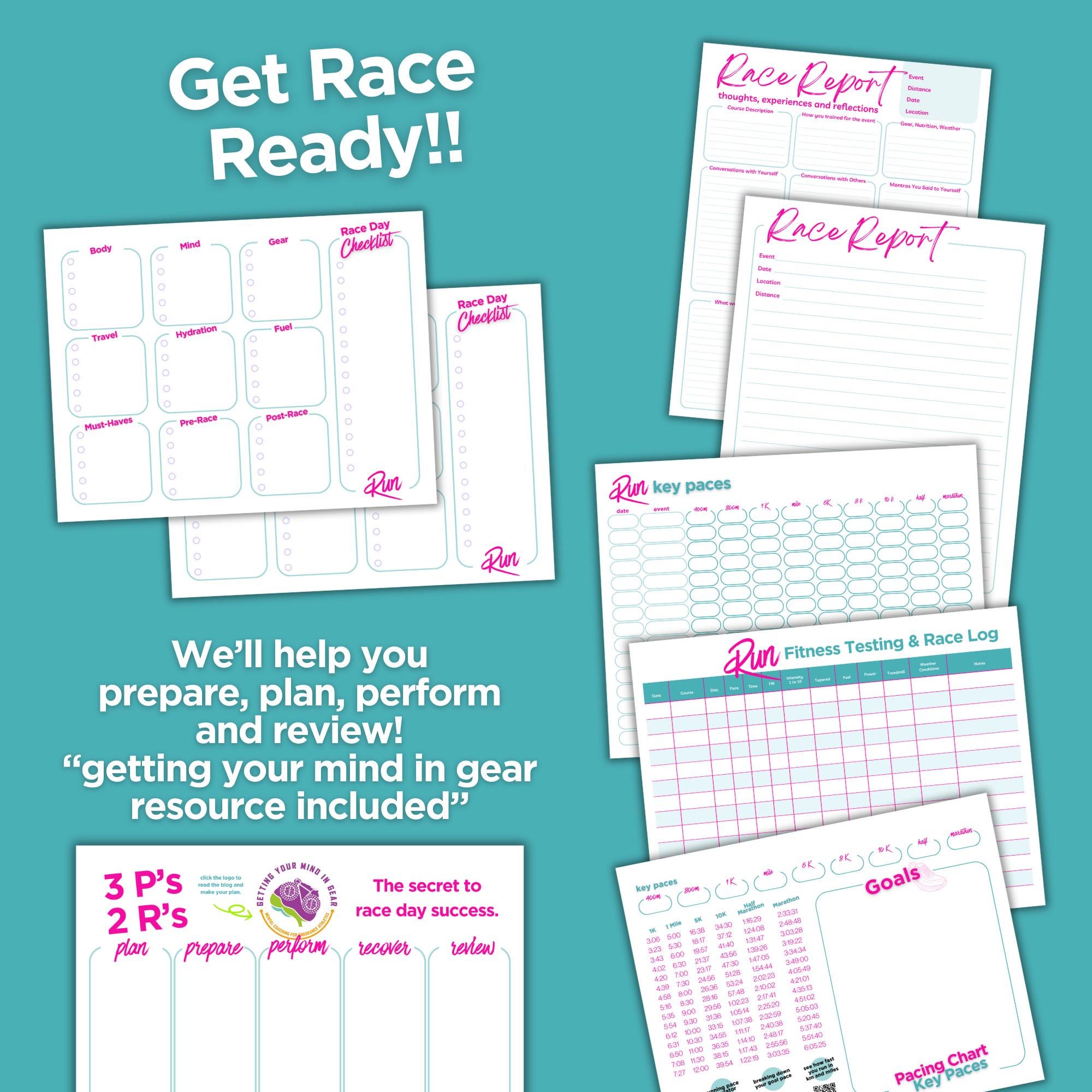 ✪ Get Race Ready with the 3P’s and 2R’s worksheet. (Plan, Prepare, Perform, Recover, and Review) Click the logo to the “Getting your mind in Gear” blog to make your plan for race day a success. Plan with a race day checklist. Review with a Post Race Report. Everything you’ll need to get you to the start line feeling prepared.