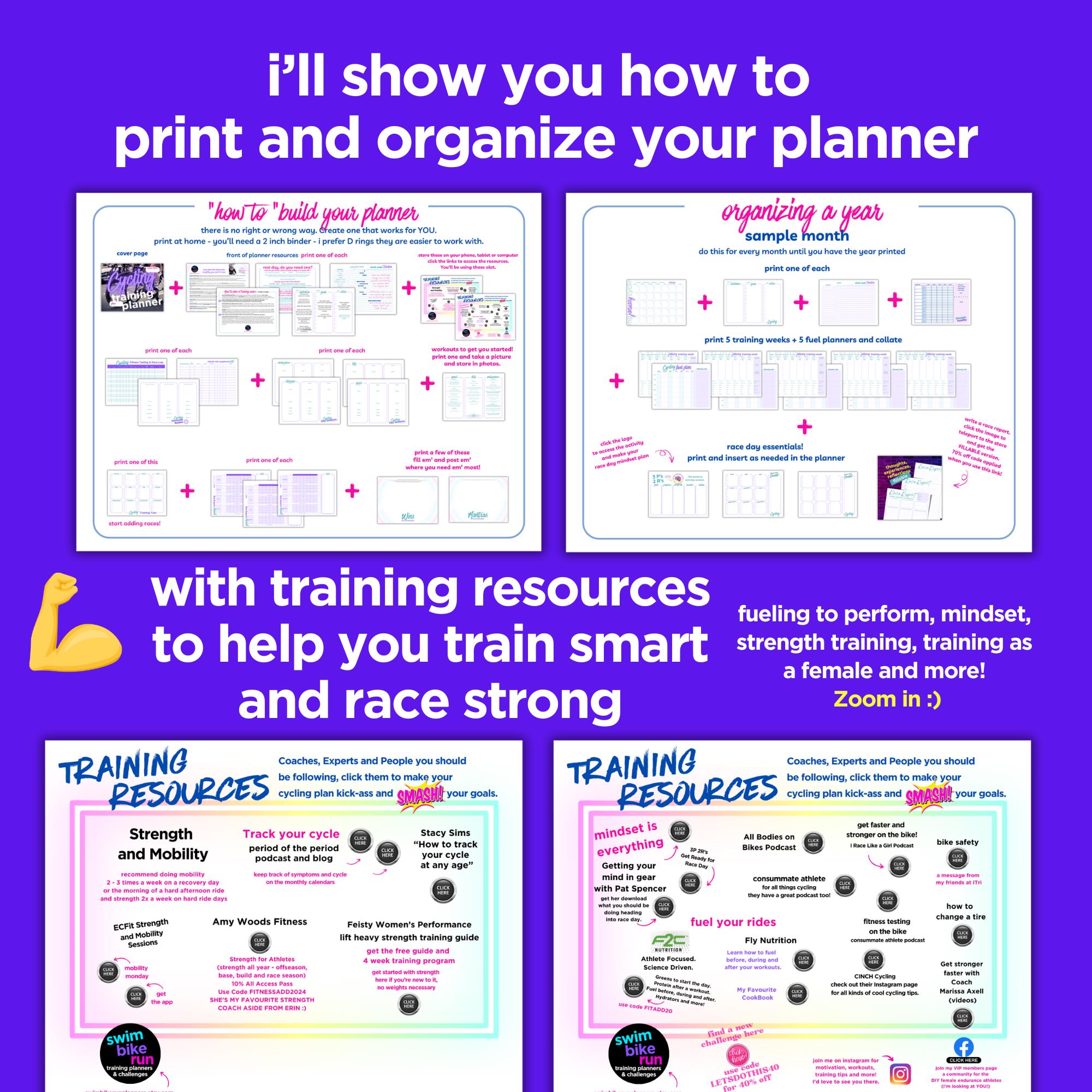 The files are ready to print, organize and assemble into a binder. What I love about a binder is that it makes adding and removing pages easy as your training evolves. When the year is done you can put it on the shelf, add photos for memories, look back at race reports and race plans easily.