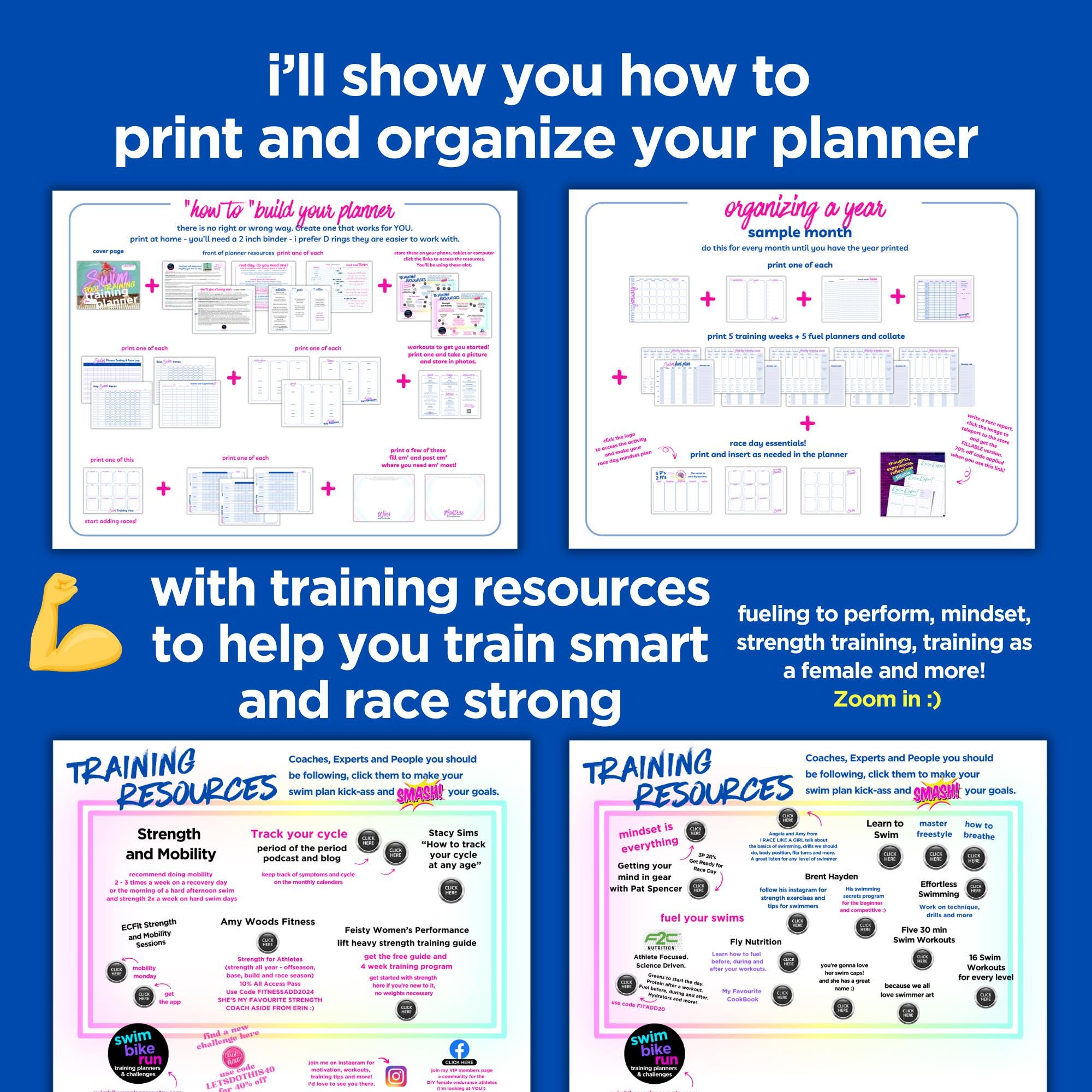 The files are ready to print, organize and assemble into a binder. What I love about a binder is that it makes adding and removing pages easy as your training evolves. And when the year is done you can put it on the shelf. Add photos for memories. Look back at race reports and race plans easily.